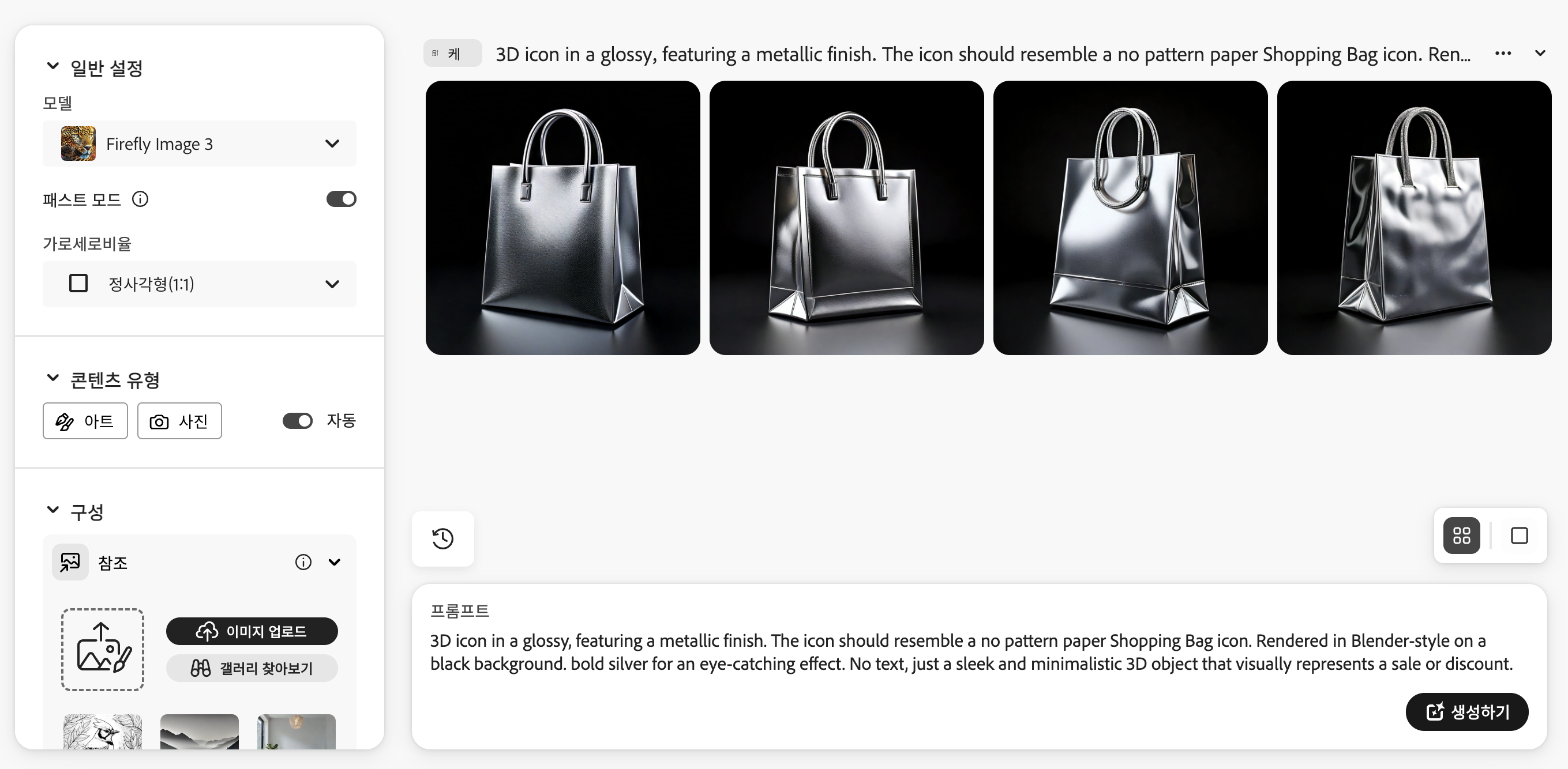 나는 실버, 메탈 재질의 3D 아이콘을 제작하고 싶었고, 아래 프롬프트를 입력해 원하는 3D 그래픽을 생성할 수 있었다. 고화질의 그래픽을 활용하면 배너의 시각적 완성도를 높일 수 있다. Firefly는 다양한 스타일 옵션을 제공하여 아이콘의 질감, 조명, 각도 등을 세부적으로 조정할 수 있다고한다. 아직 배우는 단계라 원하는 이미지를 한번에 생성할 수는 없지만, 프롬프트를 고쳐가면서 제작이 가능하니 원하는 스타일의 3D 그래픽을 제작해보자.