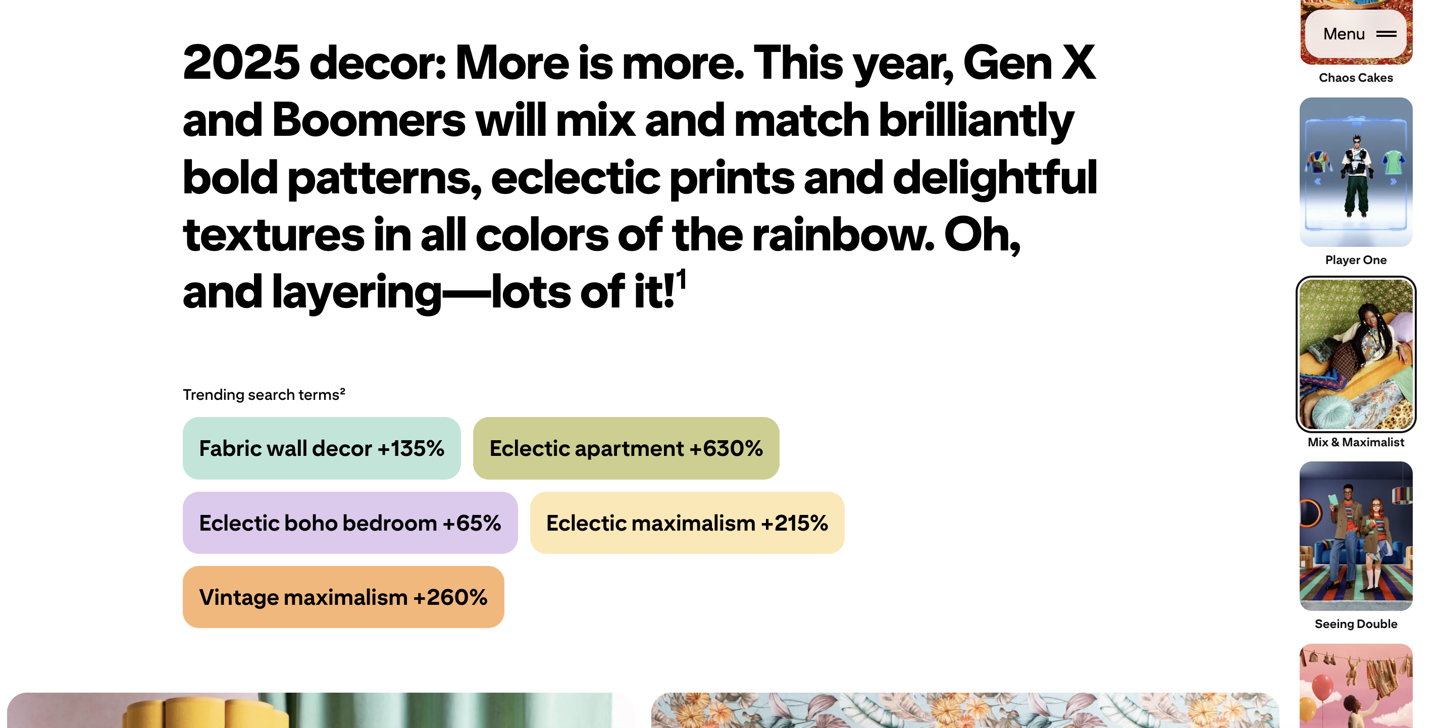 트렌드는 늘 빠르게 바뀌고, 유행은 예고 없이 찾아온다. 최근에 흥미롭게 본 핀터레스트(Pinterest)의 Pinterest Predicts 2025 웹사이트. 핀터레스트는 매년 ‘Pinterest Predicts’라는 이름으로, 아직 유행하지 않았지만 곧 떠오를 트렌드를 분석해 공개한다. 실제로 핀터레스트가 예측한 트렌드는 평균적으로 80% 이상 적중률을 보였다고 한다. 2025년 버전인 Pinterest Predicts 2025는 핀터레스트 유저들의 검색 데이터를 기반으로 한 신뢰도 높은 트렌드 리포트! 웹사이트도 감각적이라 디자이너, 마케터라면 한번 웹사이트를 방문해보자.