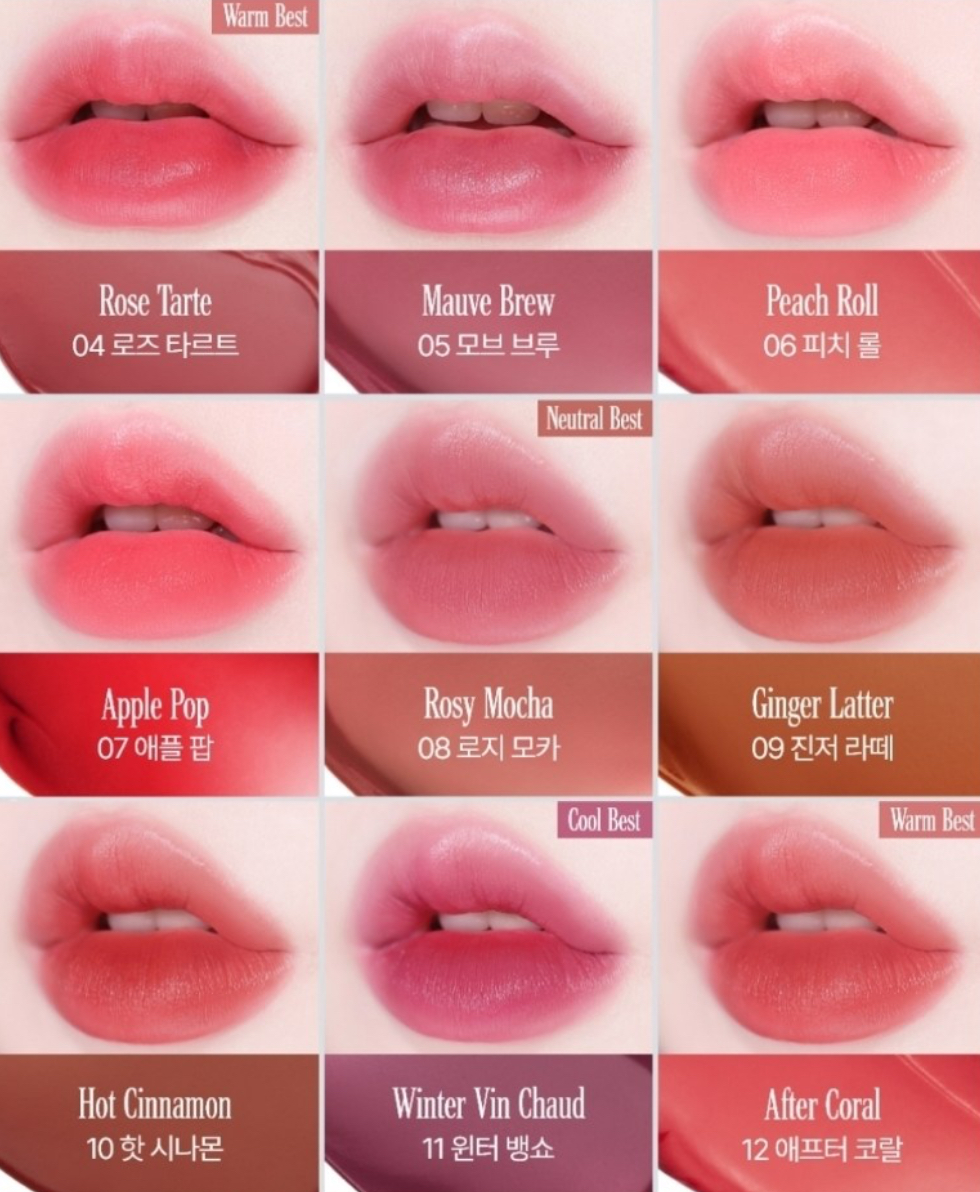 • 롬앤 07 체리밤 : 선명한 체리 레드 컬러. 피부를 확 밝혀주는 컬러! 겨울 쿨톤에는 레드 계열 립스틱도 잘 어울린다.