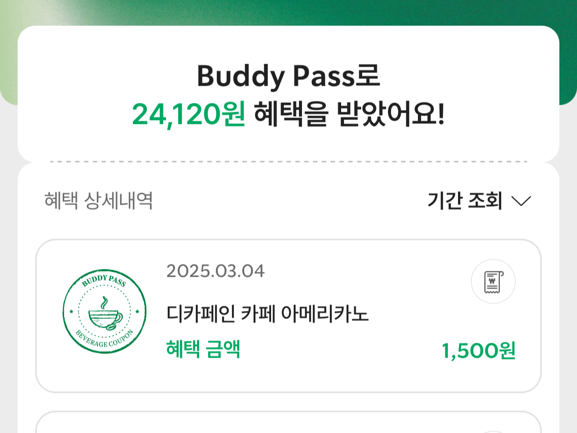나는 최근 한달간 14장의 버디패스(Buddy Pass) 쿠폰을 사용했고, 24,120원의 혜택을 받았다.