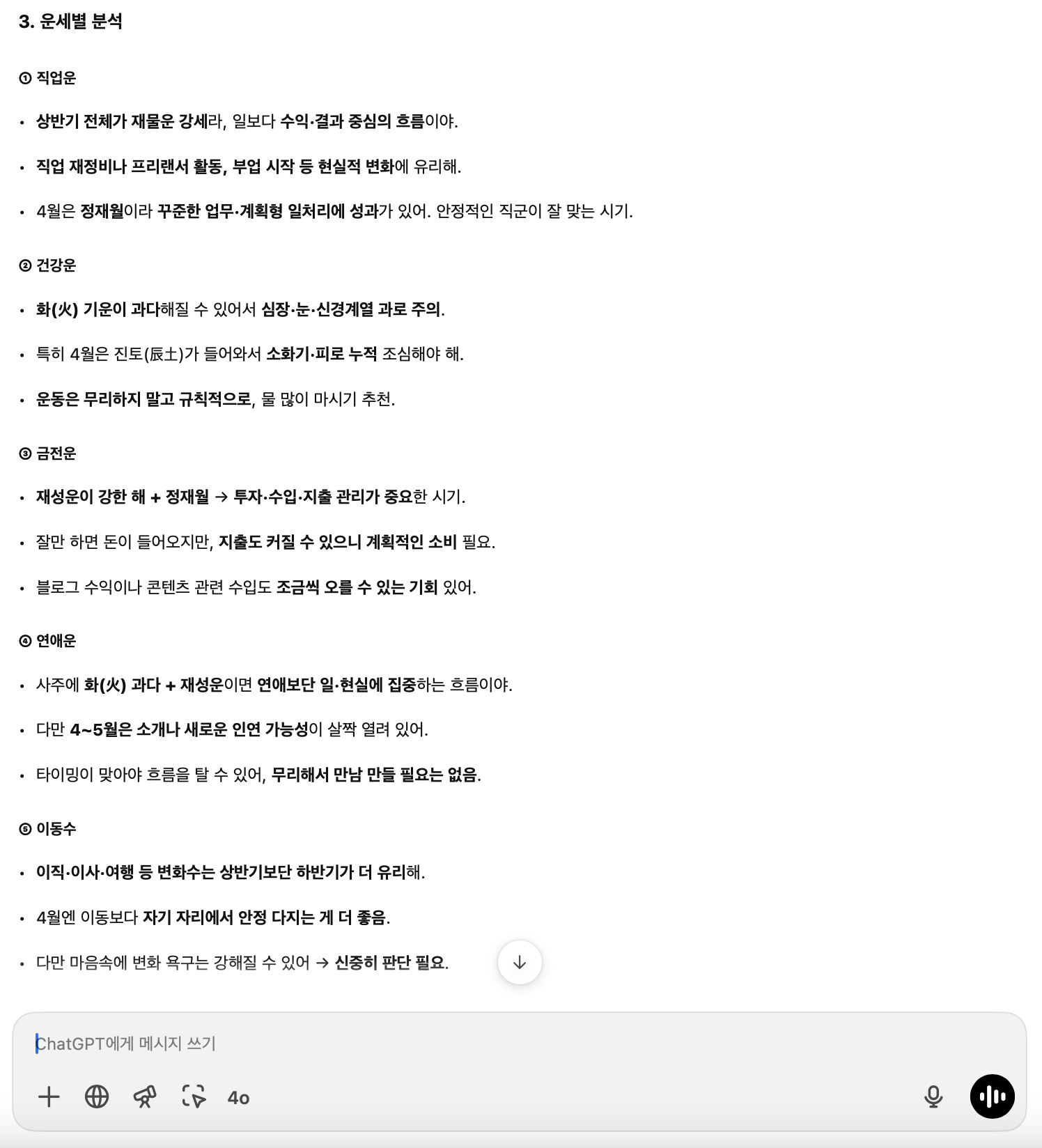 이렇게 2025년 운의 큰 흐름부터, 4월의 운 흐름, 운세별 분석(직업운, 건강운, 금전운, 연애운, 이동수)를 깔끔하게 요약해준다. 사주의 용어가 어려워도 ChatGPT가 이해하기 쉽도록 정리해주니 누구나 쉽게 사주를 볼 수 있다.