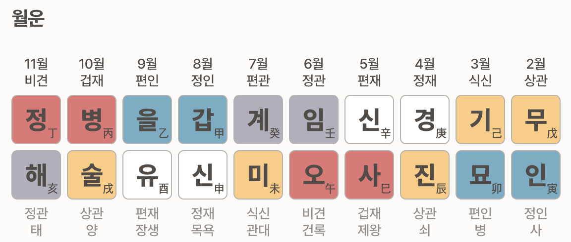 재성운이 강한 해 + 정재월 → 투자·수입·지출 관리가 중요한 시기. 잘만 하면 돈이 들어오지만, 지출도 커질 수 있으니 계획적인 소비 필요. 블로그 수익이나 콘텐츠 관련 수입도 조금씩 오를 수 있는 기회 있다.