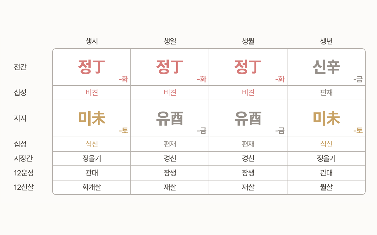 내 사주에는 관성인 ‘정관’, ‘편관’이 없다. 십성 중 관이 없어 무관사주다. 무관사주는 전통적인 규칙이나 사회적 틀보다 자유와 창의성을 더 중요하게 여기기 때문에 조직적인 환경보다는 자율적인 분위기, 감각과 표현이 중요한 분야에서 더 잘 맞는다. 나는 디자인과 콘텐츠 작업을 해왔는데, 돌이켜보면 무관사주인 내 기질과 딱 맞는 일을 선택해왔던 것 같다.