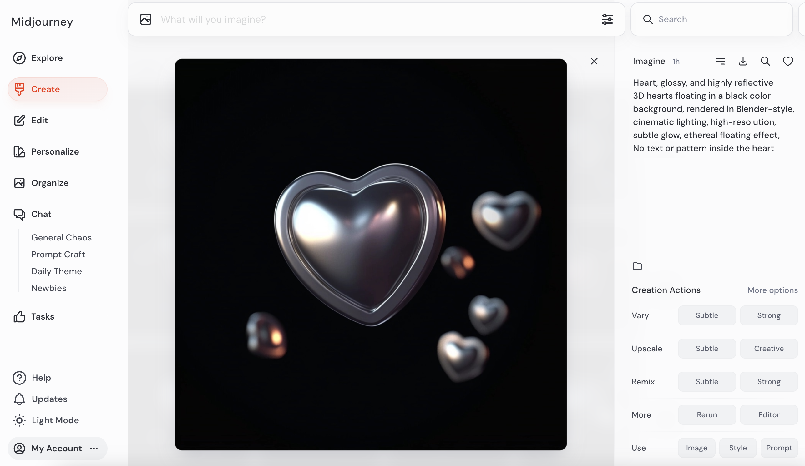 미드저니(MidJourney)는 AI 기반 이미지 생성 툴로 원하는 스타일과 변형을 적용할 수 있는 다양한 기능을 제공한다. 오늘은 Creation Actions(생성 액션) 기능을 소개하고, 3D 하트 그래픽을 예제로 활용하여 각 기능을 어떻게 사용할 수 있는지 공부해봤다.