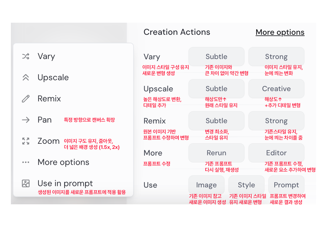Creation Actions는 미드저니에서 생성한 이미지를 더 세부적으로 수정하거나 변형할 수 있는 기능을 모아둔 메뉴다. 이 기능을 활용하면 원하는 이미지의 퀄리티를 높이거나, 색감·구도를 조정할 수 있다. (우측 하단에서 확인할 수 있다.)