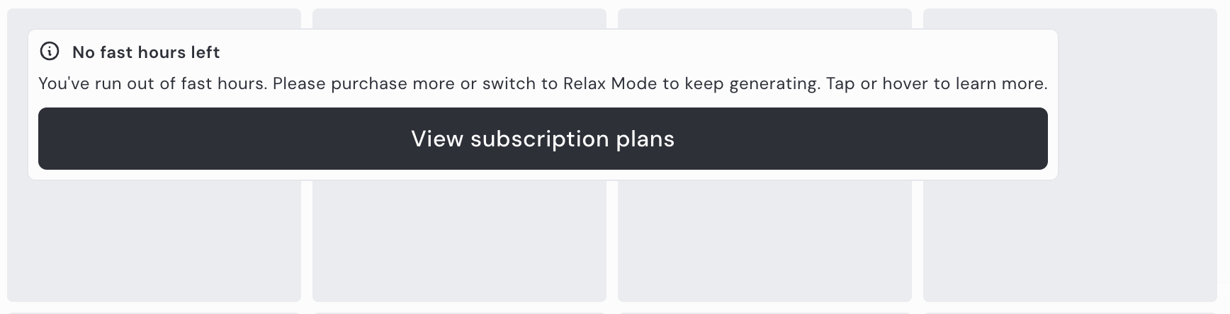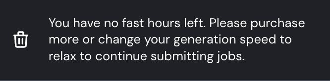 'No fast hours left. You've run out of fast hours. Please purchase more or switch to Relax Mode to keep generating. Tap or hover to learn more.'
